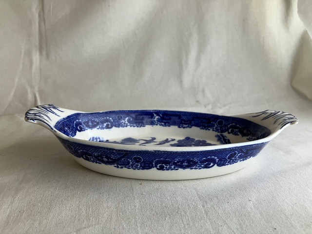 スタッフォードシャーのストークオントレントで1880年創業のW.H.Grendy &Co 製 フローブルーです。 この窯で、初期のものは、アメリカ、南米、オーストラリア向けに生産されていました。第二次世界大戦の頃も家庭用食器を制作していました。 おそらく19世紀から20世紀初めに作られています。 ◆おおよそサイズ 横220㎜ ×140㎜ 深さ 30mm 「フローブルー」とは、英国で1820年代、窯の温度が一定でなく顔料のコバルトがにじんでしまうためにじんだような青になりこう呼ばれています。英国では当時失敗作とみなされていましたが、米国では人気があり輸出されました。今は英国でも日本でも近年人気がでてきました。こちらのお皿は、裏側も、もわーっと薄く青い感じが何とも言えずにいいですね。 裏面に土に影響のない、釉薬だけの貫入があります。