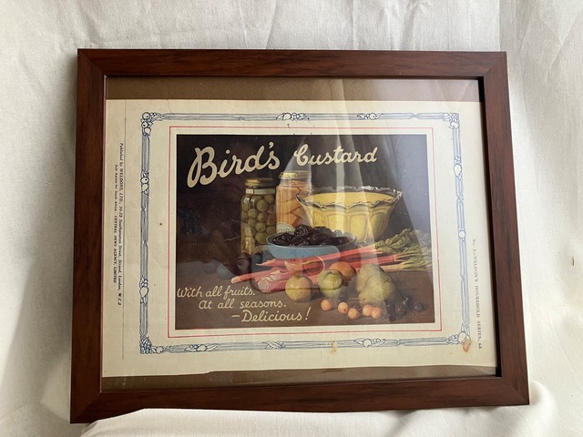 1910年の雑誌の広告ページを額に入れたものです。英国で昔からカスタードクリームといえばこのBird製です。お菓子作りの好きな方にはいいコレクションになるのではないでしょうか? 最近の軽量額でアクリル板が入っています。マットでなく、台紙にブラウンの紙を合わせています。 ◆おおよそサイズ額含む 330mm 270mm 広告サイズ 290mm 200mm