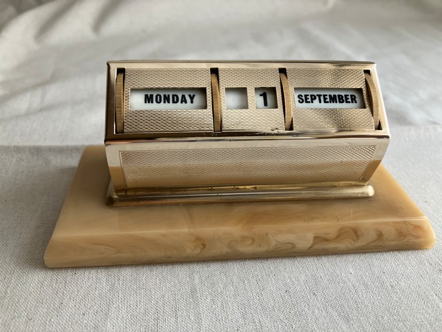 ◆おおよそのサイズ 台座120㎜ 本体 横90㎜×t高さ45㎜ 台座はベークライト(合成樹脂)のようですので、1920年~1950年頃のもの。裏には滑り止めのフェルトが貼ってあります。 ゴールドカラーの本体。カレンダーの回転動作に支障はありません。デジタルな世の中で、アナログなカレンダー、お仕事デスクのアクセントになります。