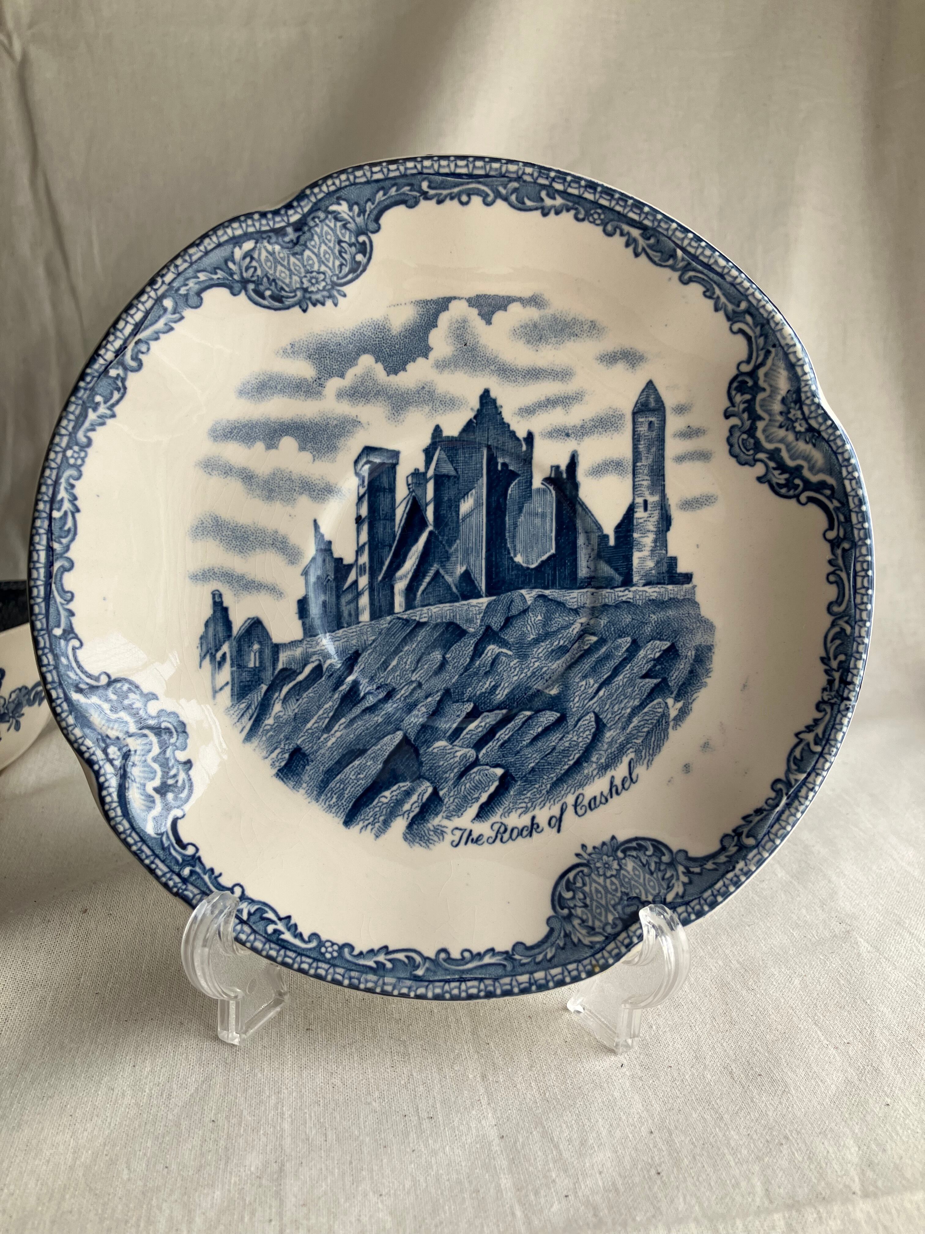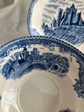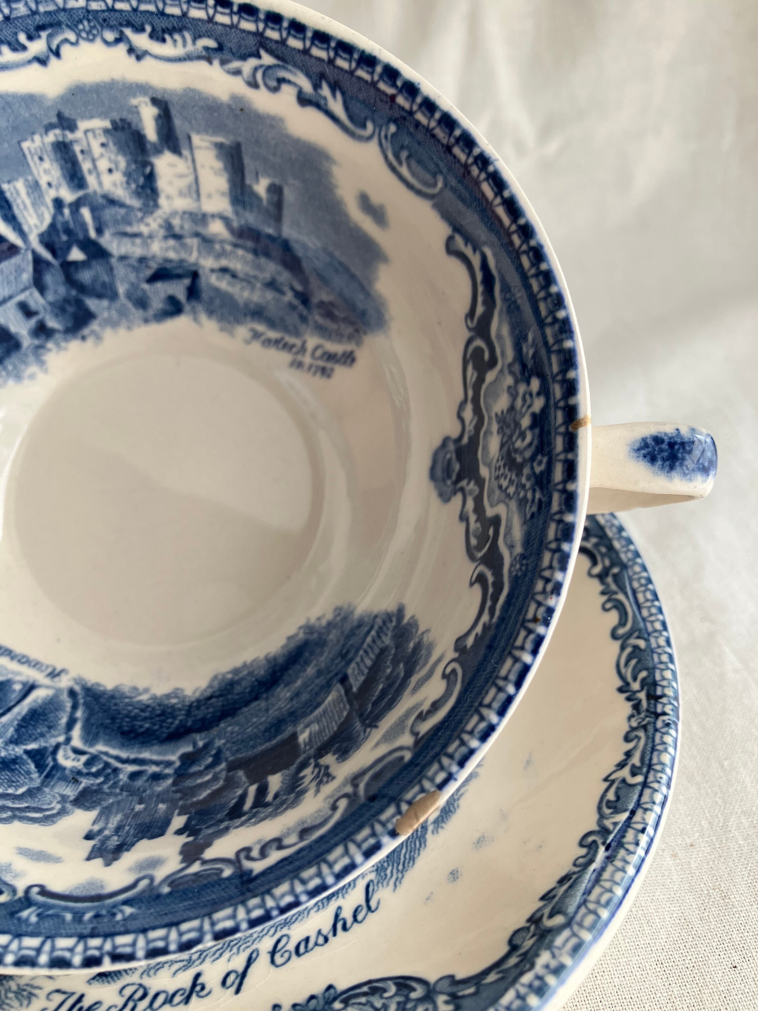 カップ(ウェールズの1792年のHewardenCastle、1792年Harlech Castle)ソーサー(現アイルランド共和国のthe Rock of cashel)に3箇所の英国の古城が描かれています。オールドブリタニアキャッスルとしているということは アイルランド独立の1921年以前に作られているものと推察されます。バックマークは1913年以降の使用なので、1913年~1921年の間に作られたアンティークです。こういう探索も店主の楽しみです。