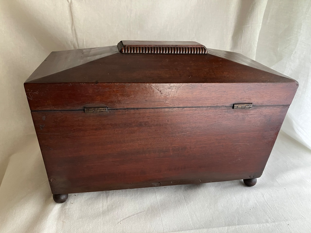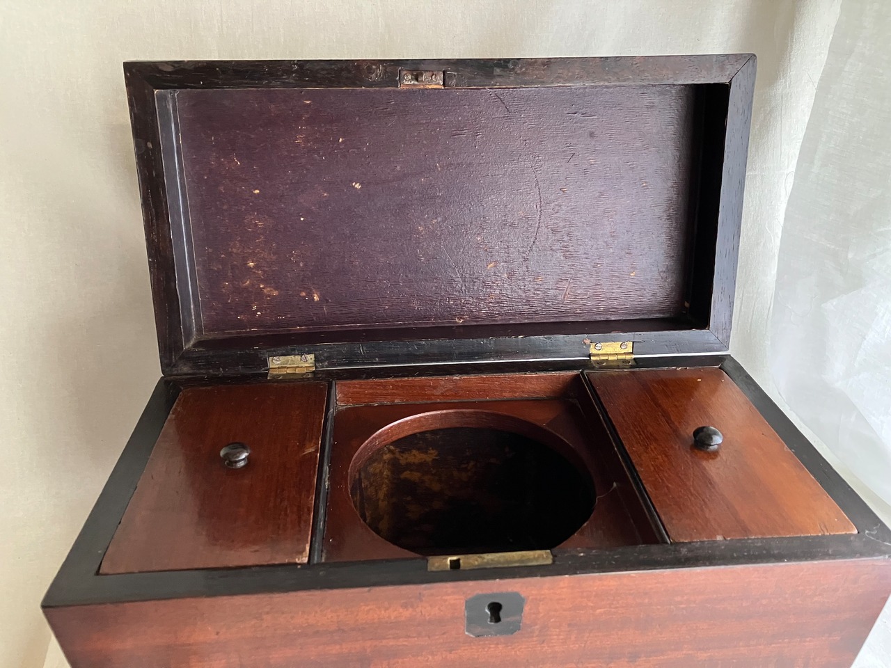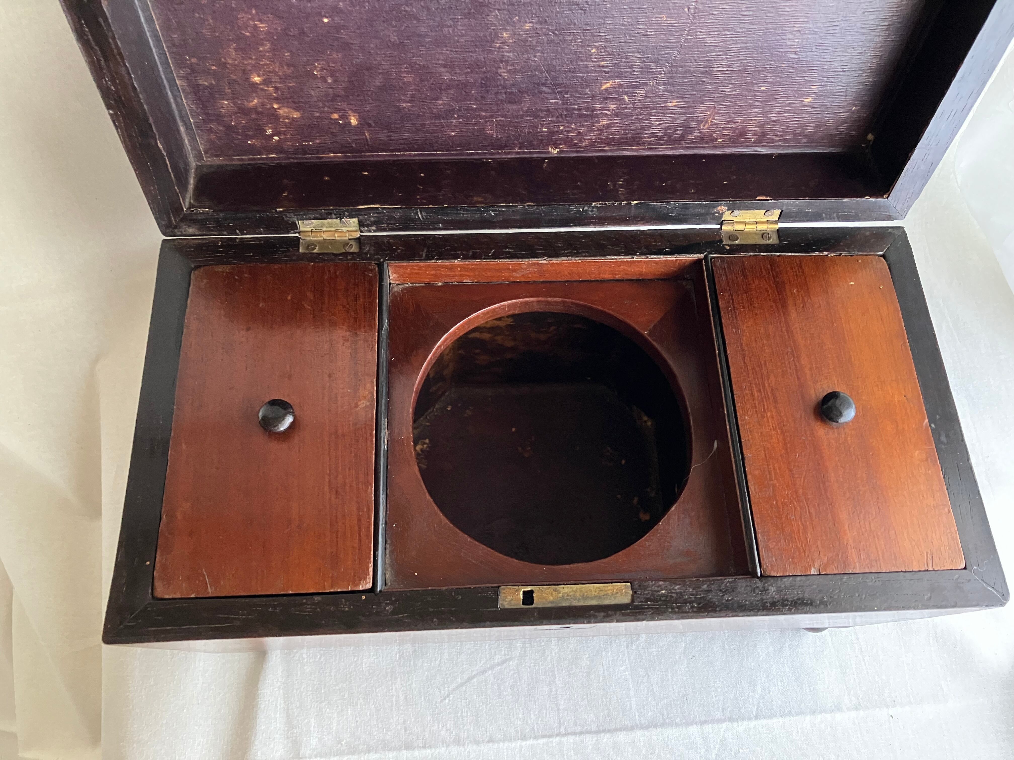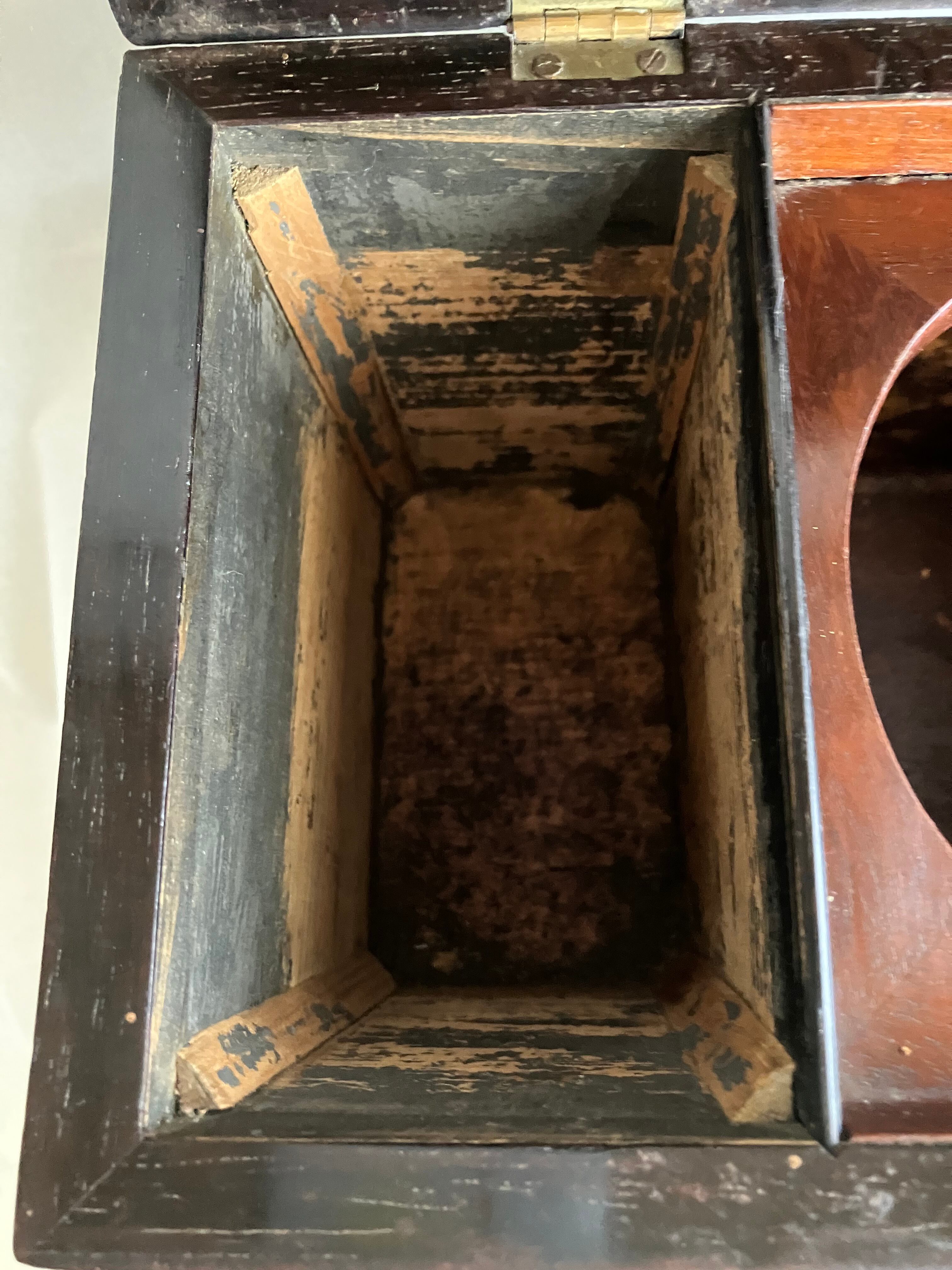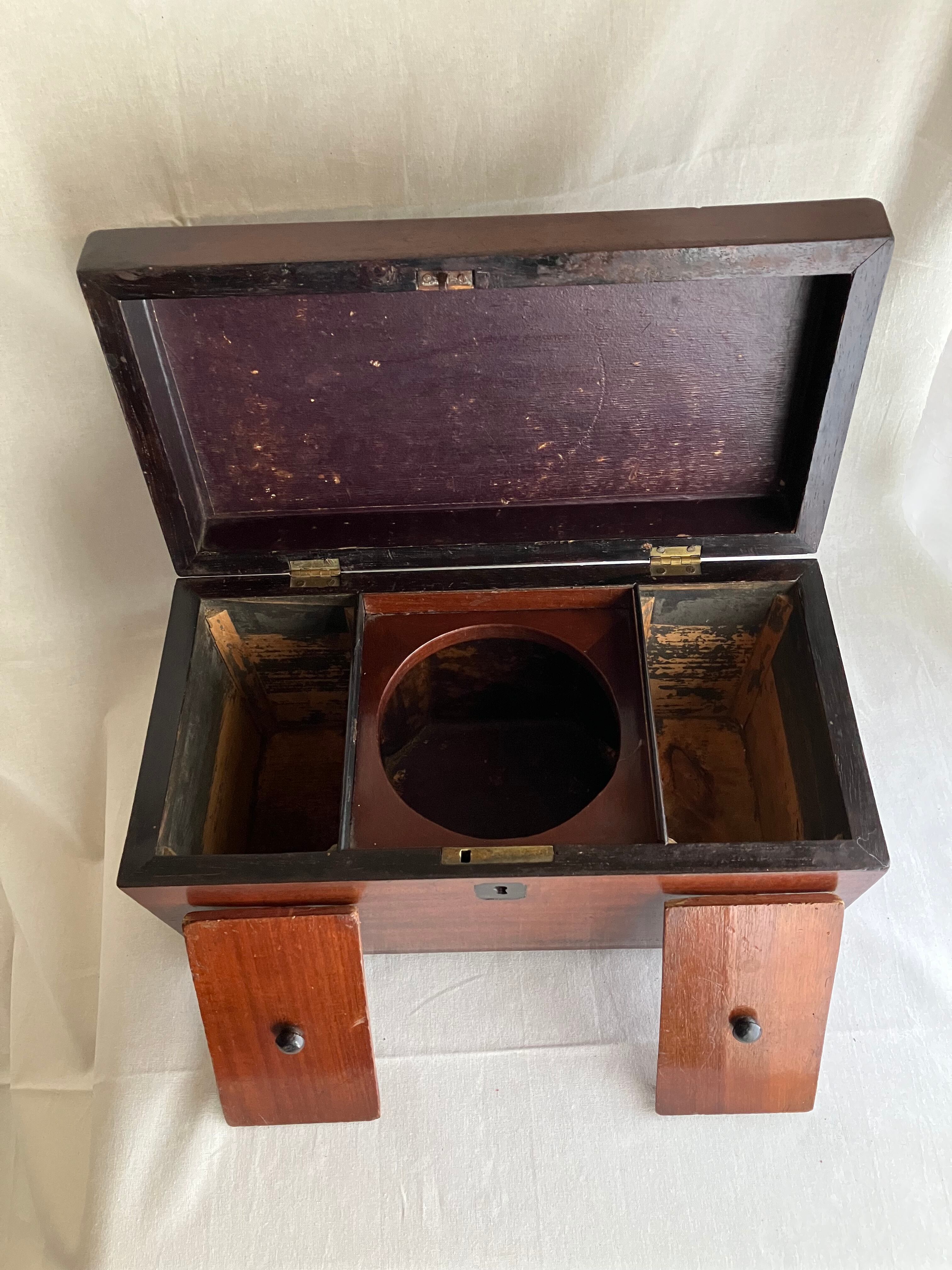 ティーキャディ―(紅茶葉入れ) 当時は真ん中にガラスのボウルをいれて、左右の異なる紅茶葉を混ぜて紅茶を淹れていました。ラプサンスーチョンのような中国茶とのブレンドがアッアッパーやアッパーミドルに好まれていたようです。当時紅茶葉は高級品のため、使用人に盗まれないように鍵をかけて管理していました。こちらはガラスと鍵はすでになくなっています。