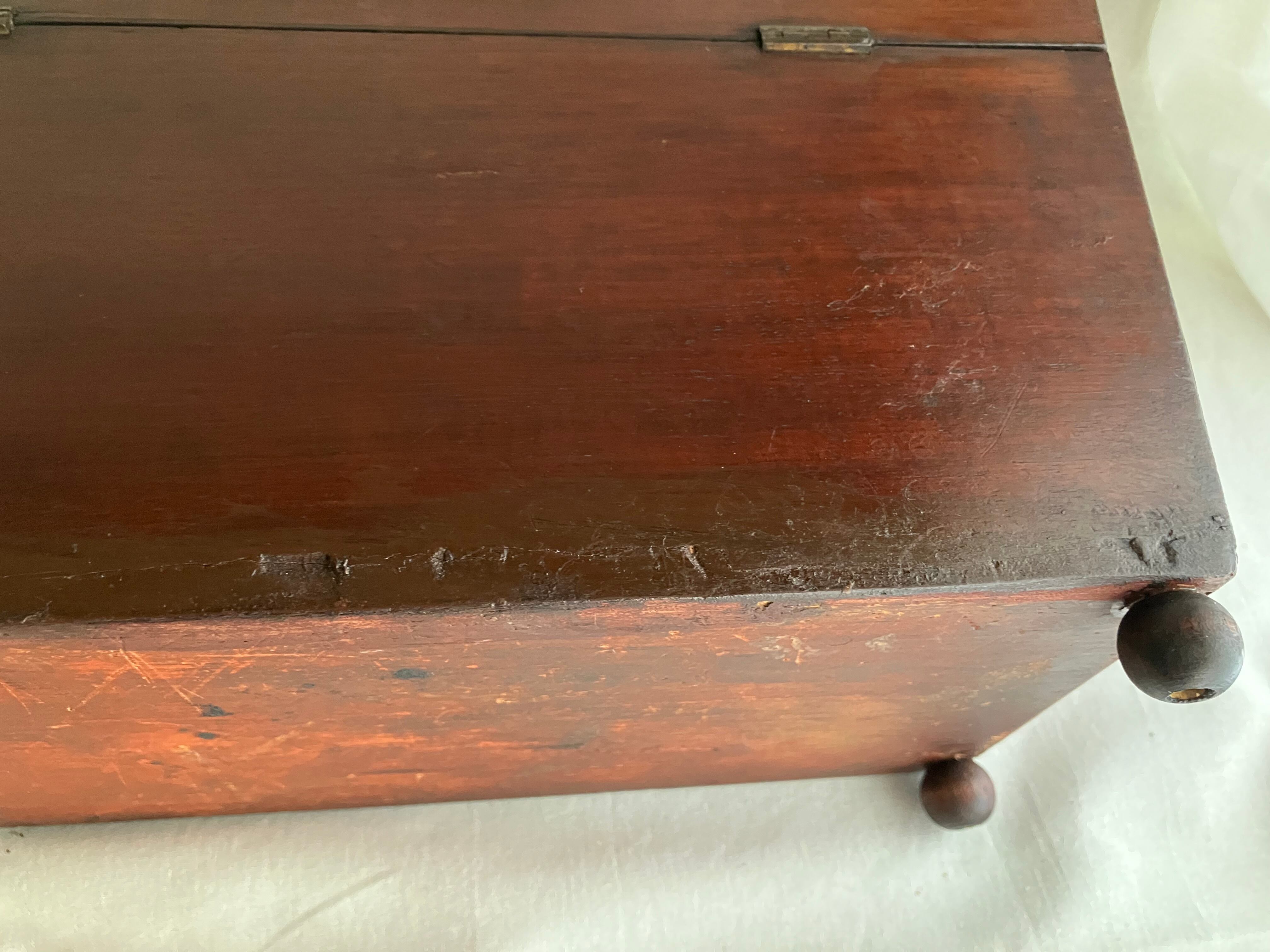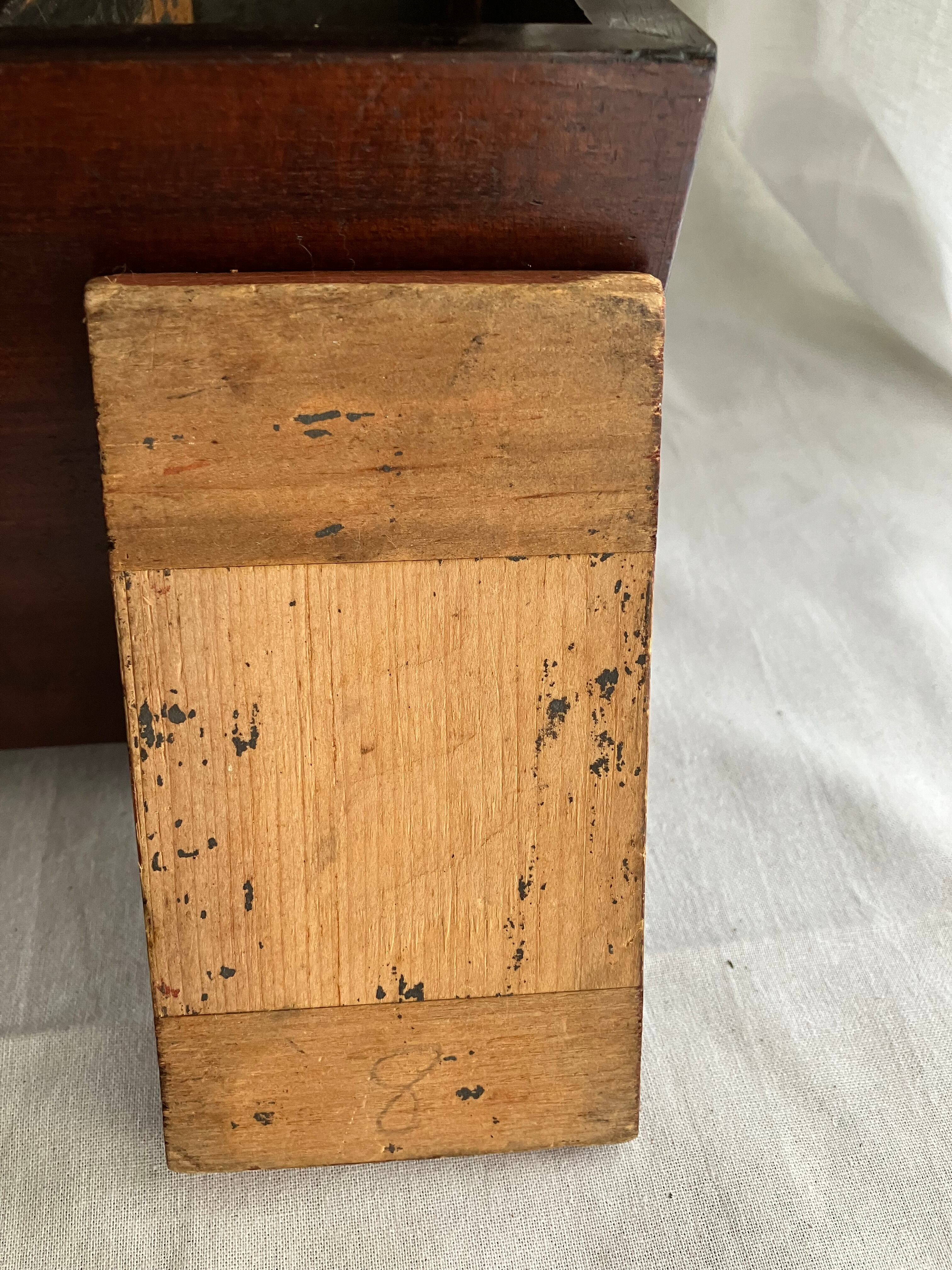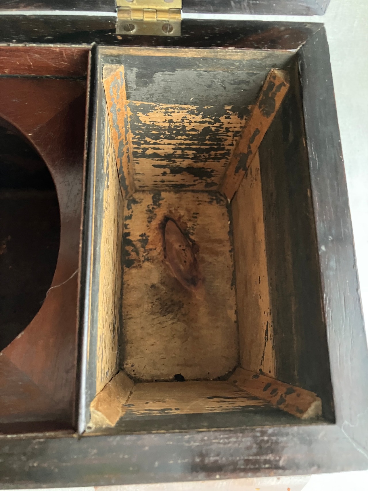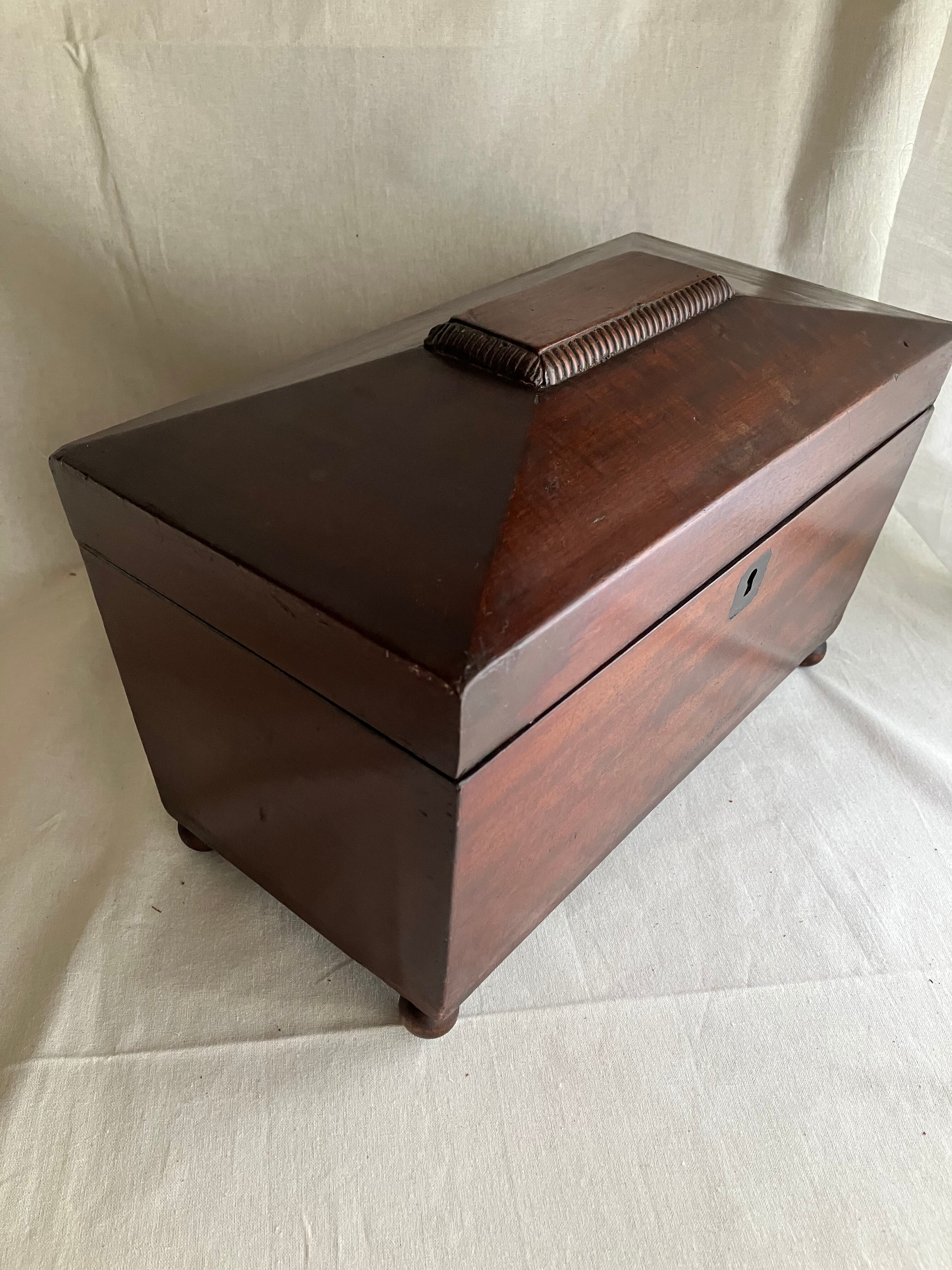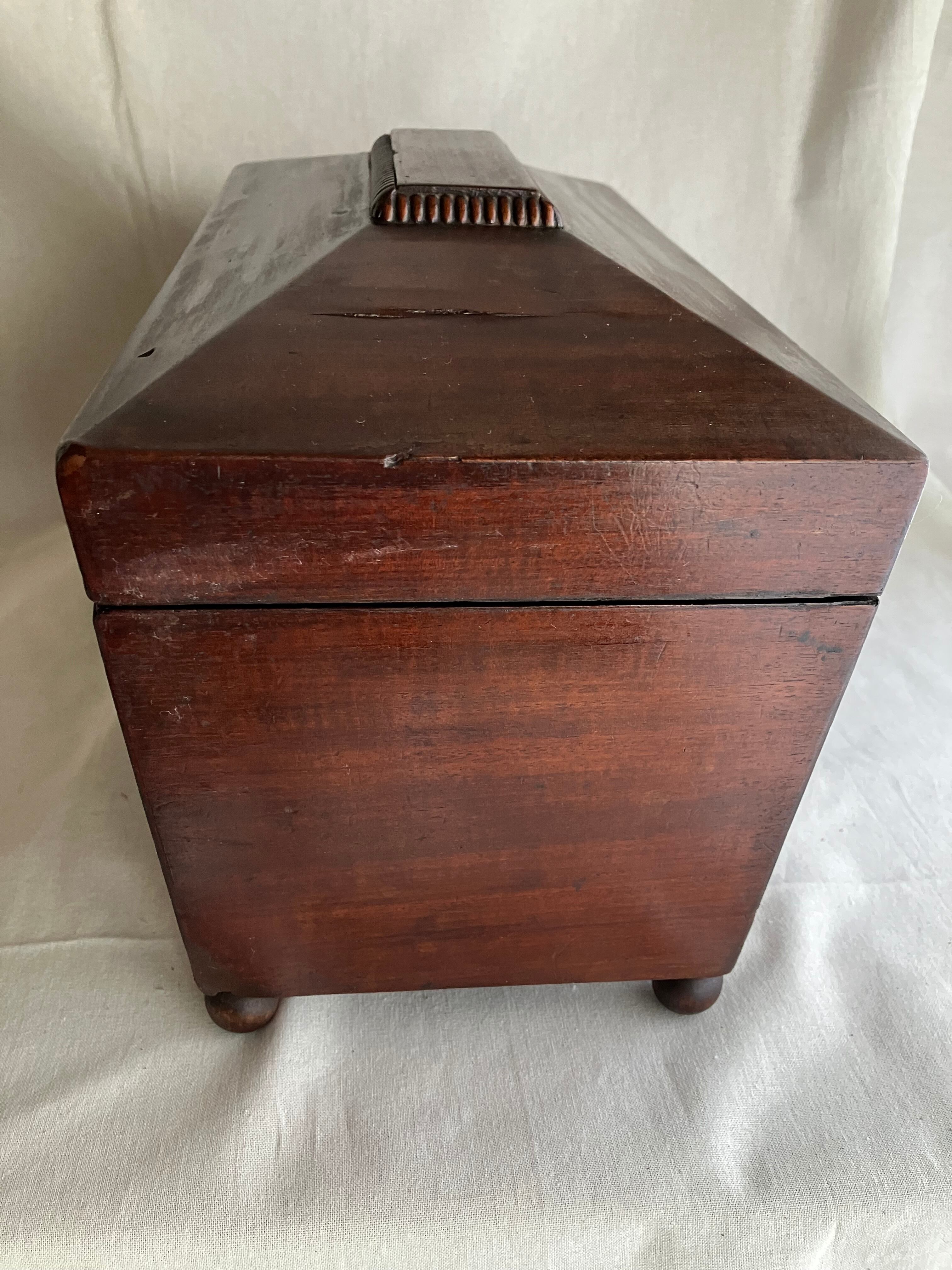 ティーキャディ―(紅茶葉入れ) 当時は真ん中にガラスのボウルをいれて、左右の異なる紅茶葉を混ぜて紅茶を淹れていました。ラプサンスーチョンのような中国茶とのブレンドがアッアッパーやアッパーミドルに好まれていたようです。当時紅茶葉は高級品のため、使用人に盗まれないように鍵をかけて管理していました。こちらはガラスと鍵はすでになくなっています。