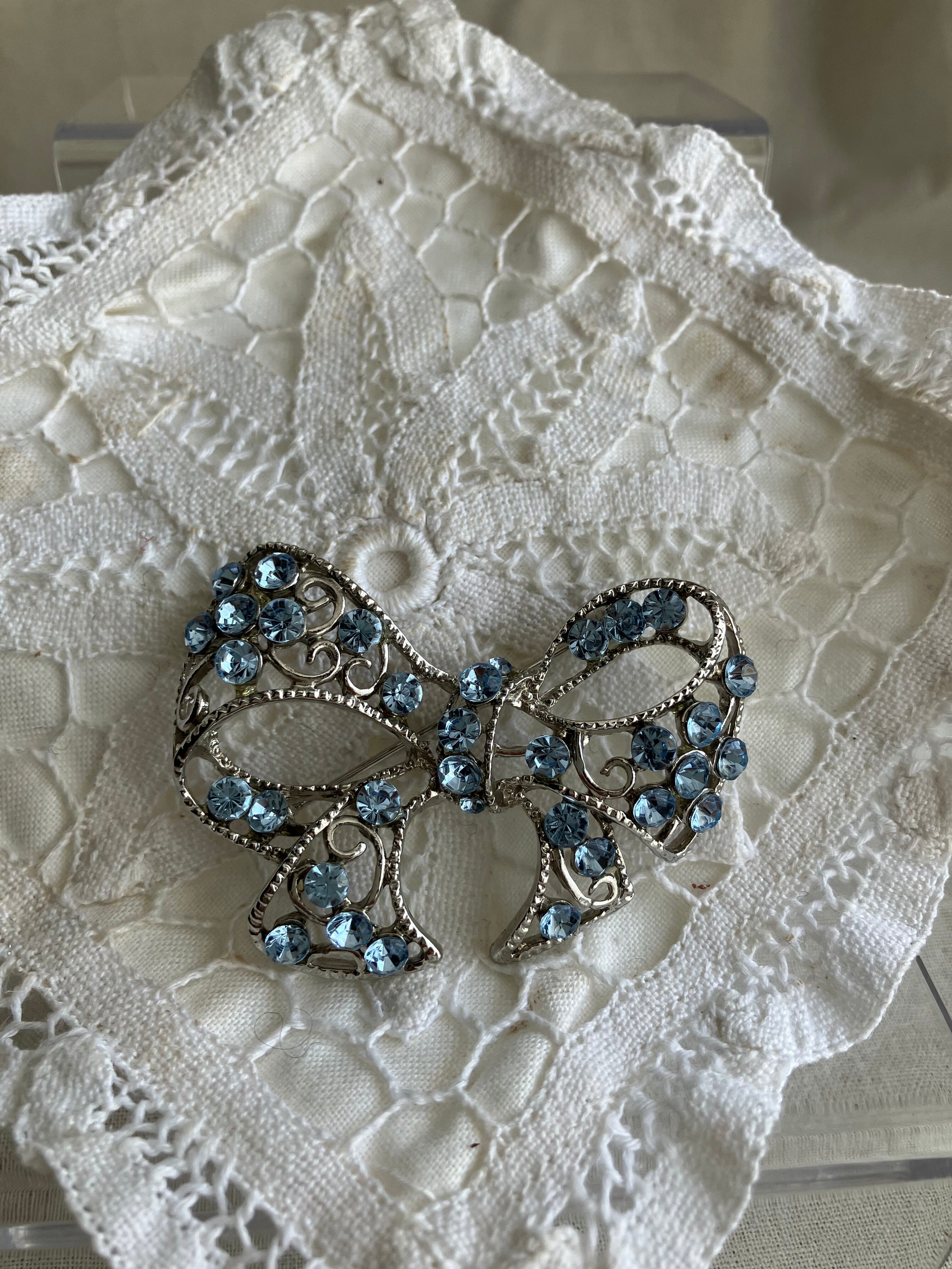 水色のガラスが入った涼やかなデザインです。黒や紺の洋服の胸元が美しく映えそうです。