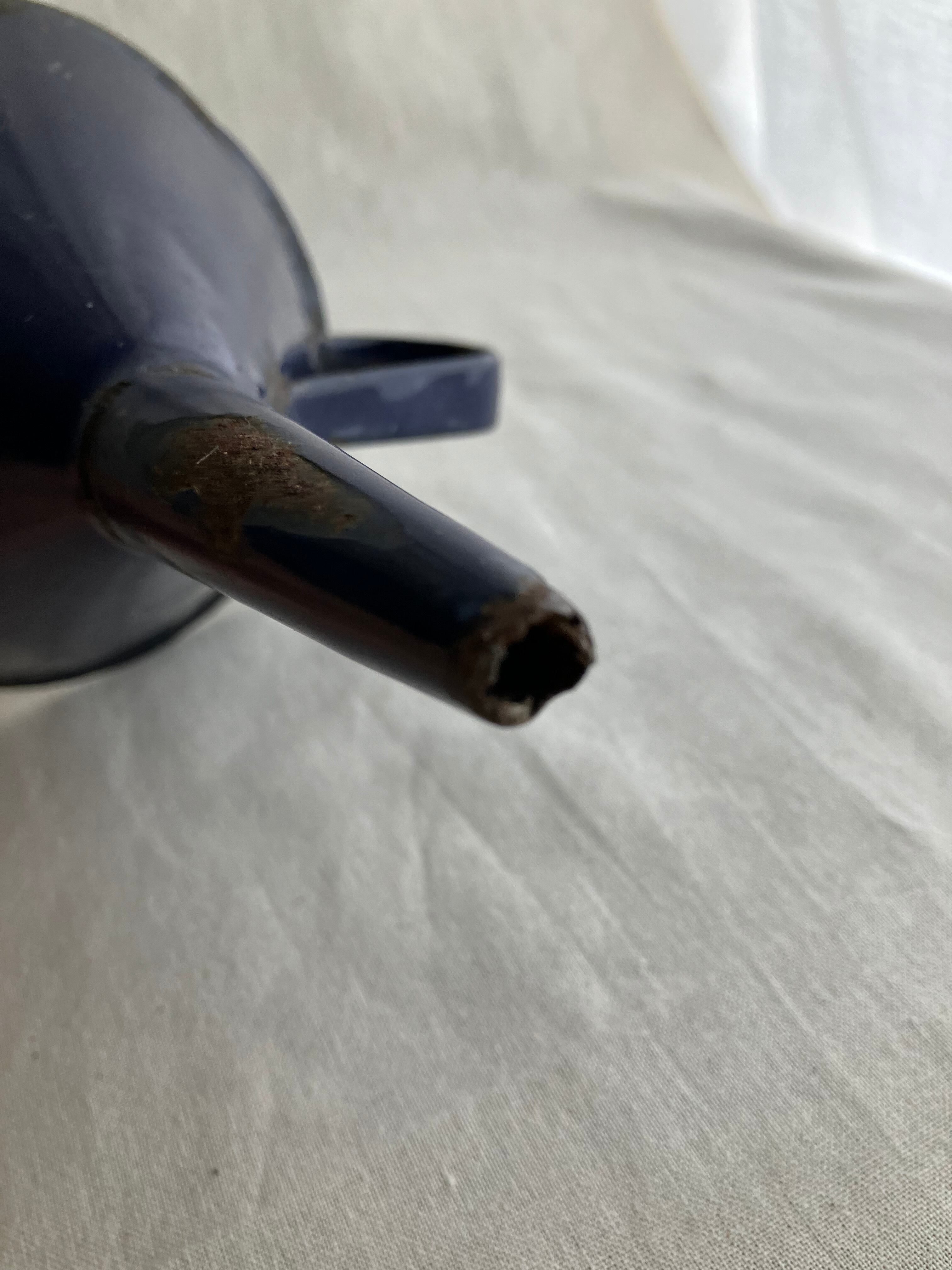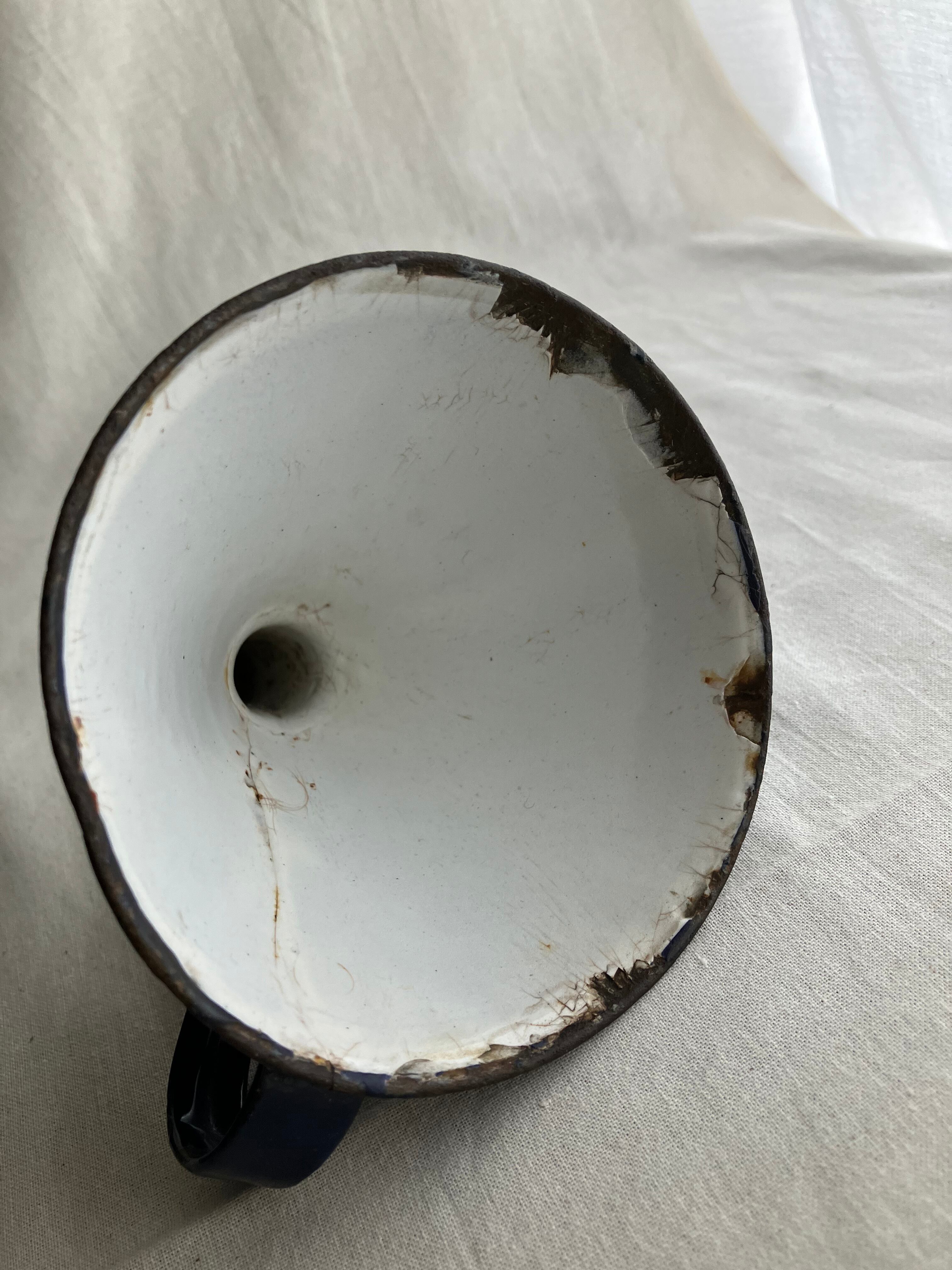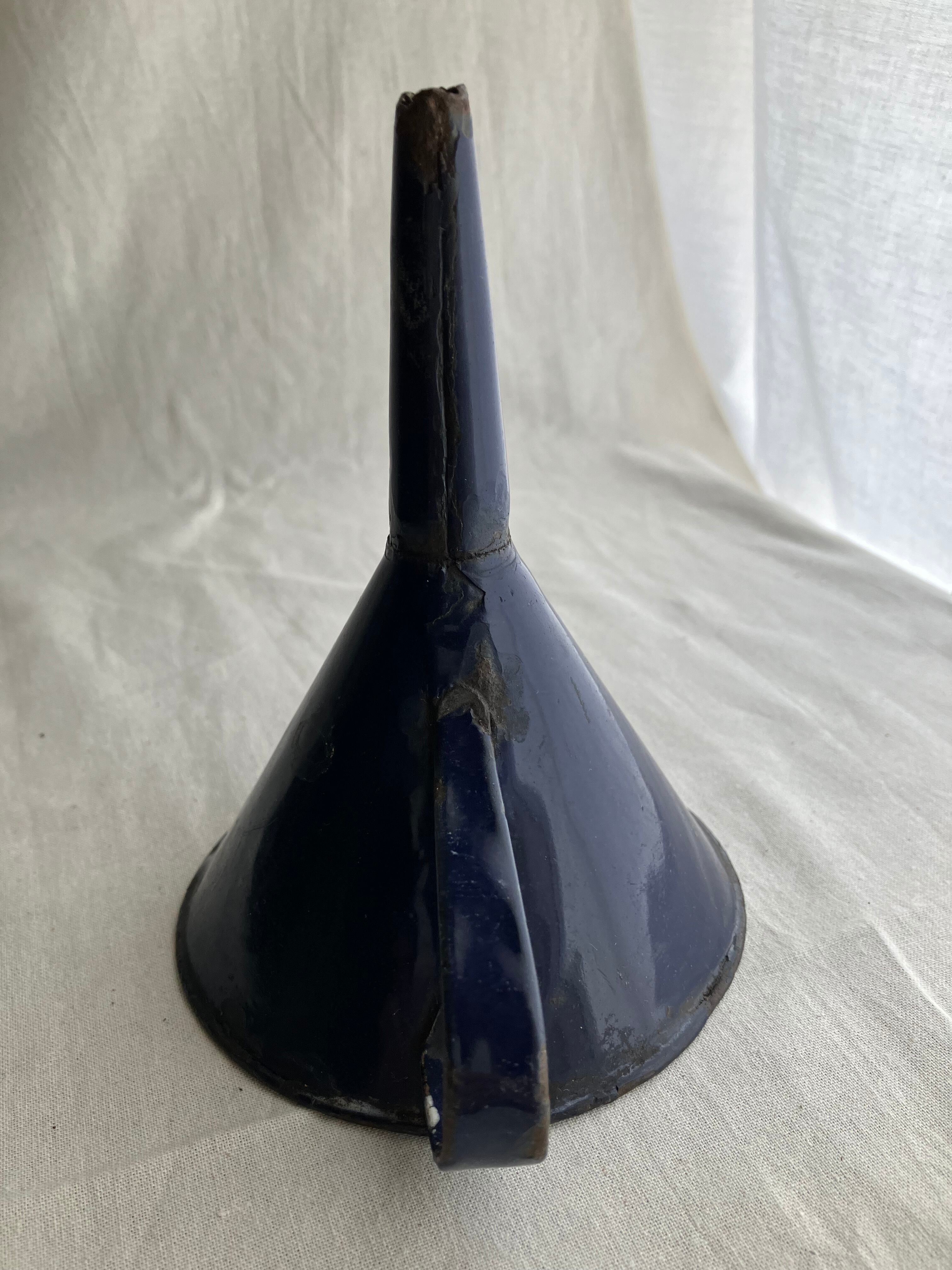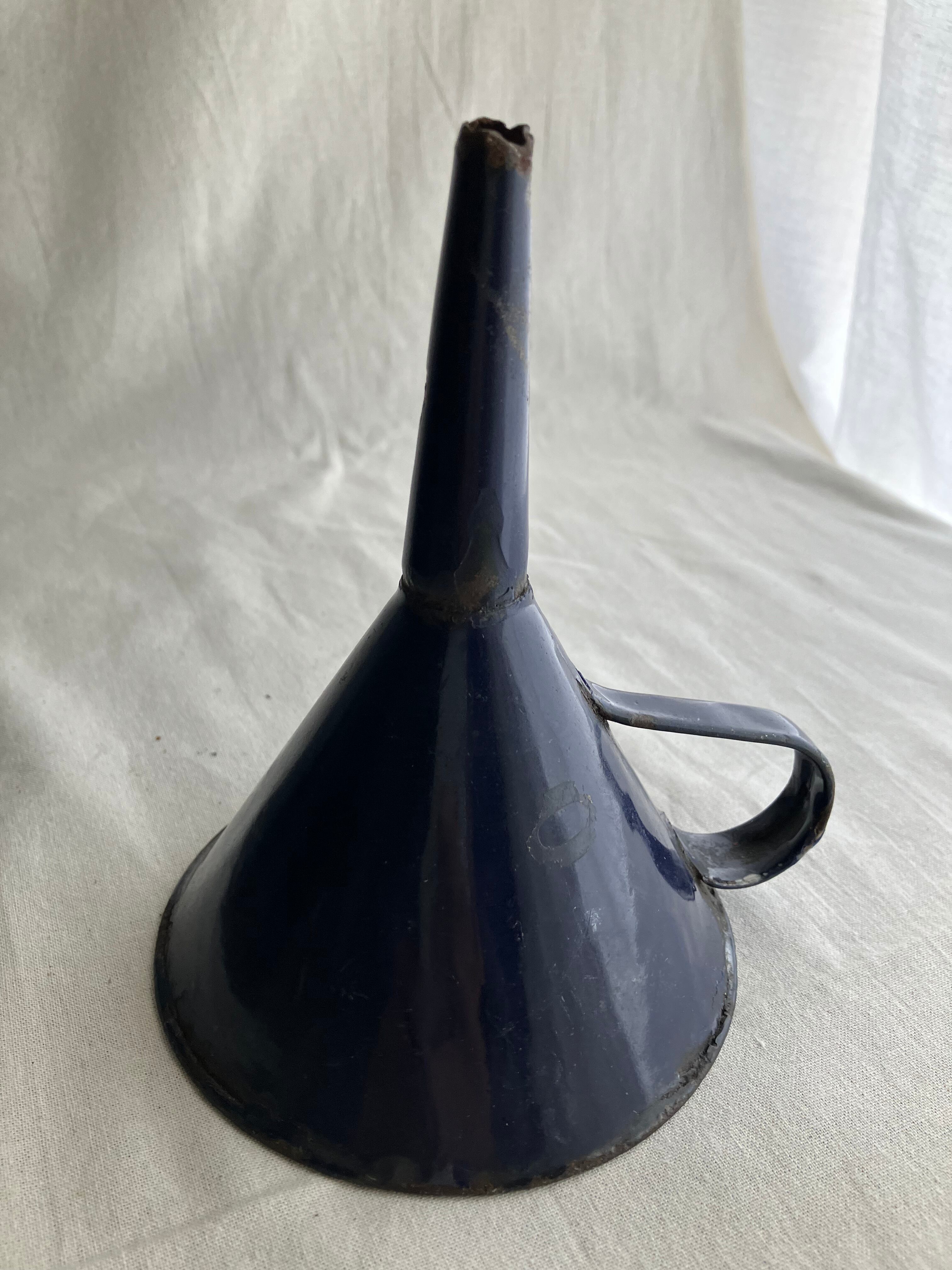 琺瑯の剥がれが渋い味を出している英国の紺色のビンテージの水筒と漏斗です。最近琺瑯の人気がでていますが、新品にはない、時代を経た剥がれが、非常にいい味を出しているものを見つけました。