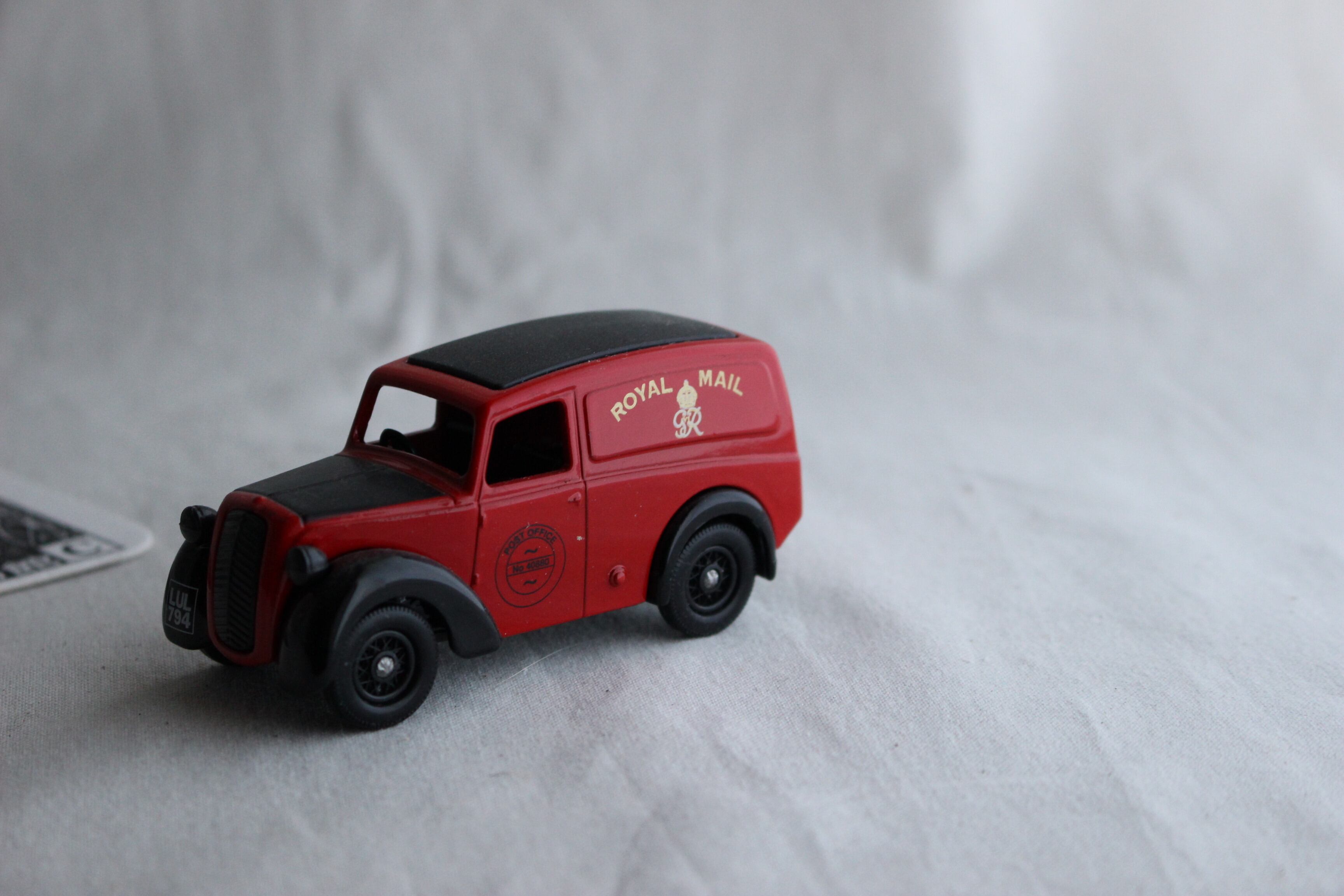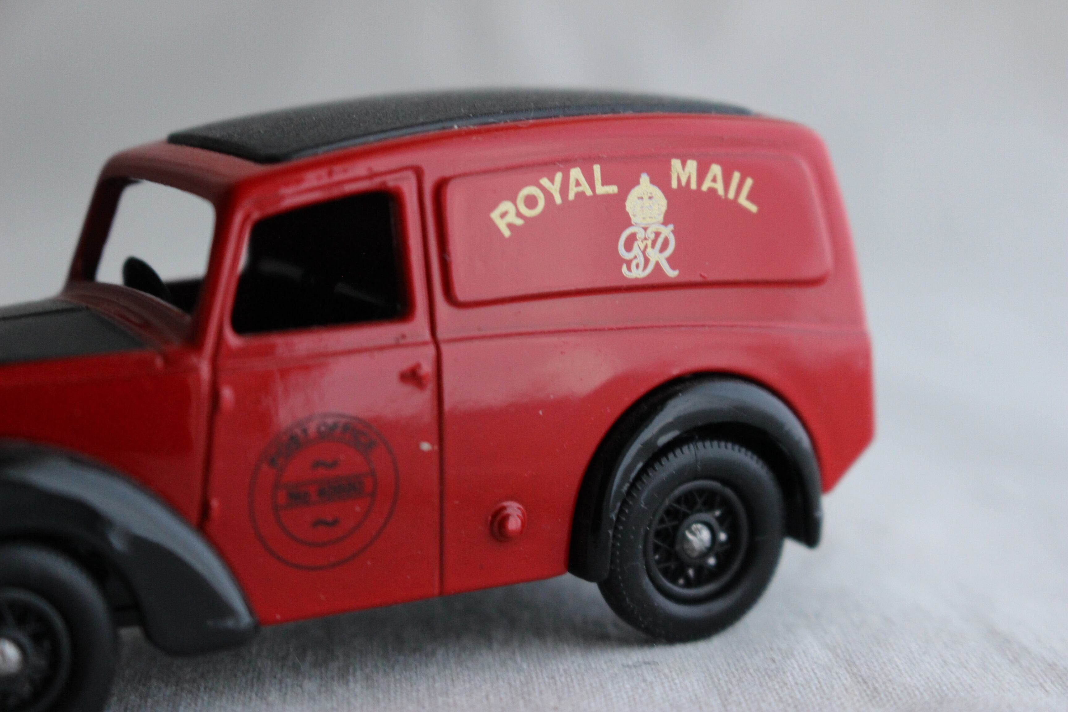 英国のLLEDO社(1982年から1999年)製で、エリザベス2世の父君、現チャールズ国王の祖父ジョージ6世時代のロイヤルメイルの車体。車体に、GVIの紋章がついています。