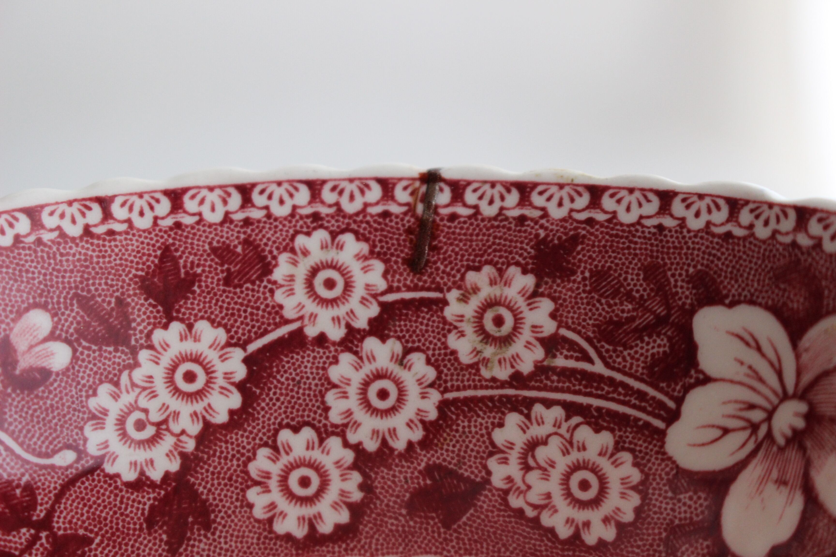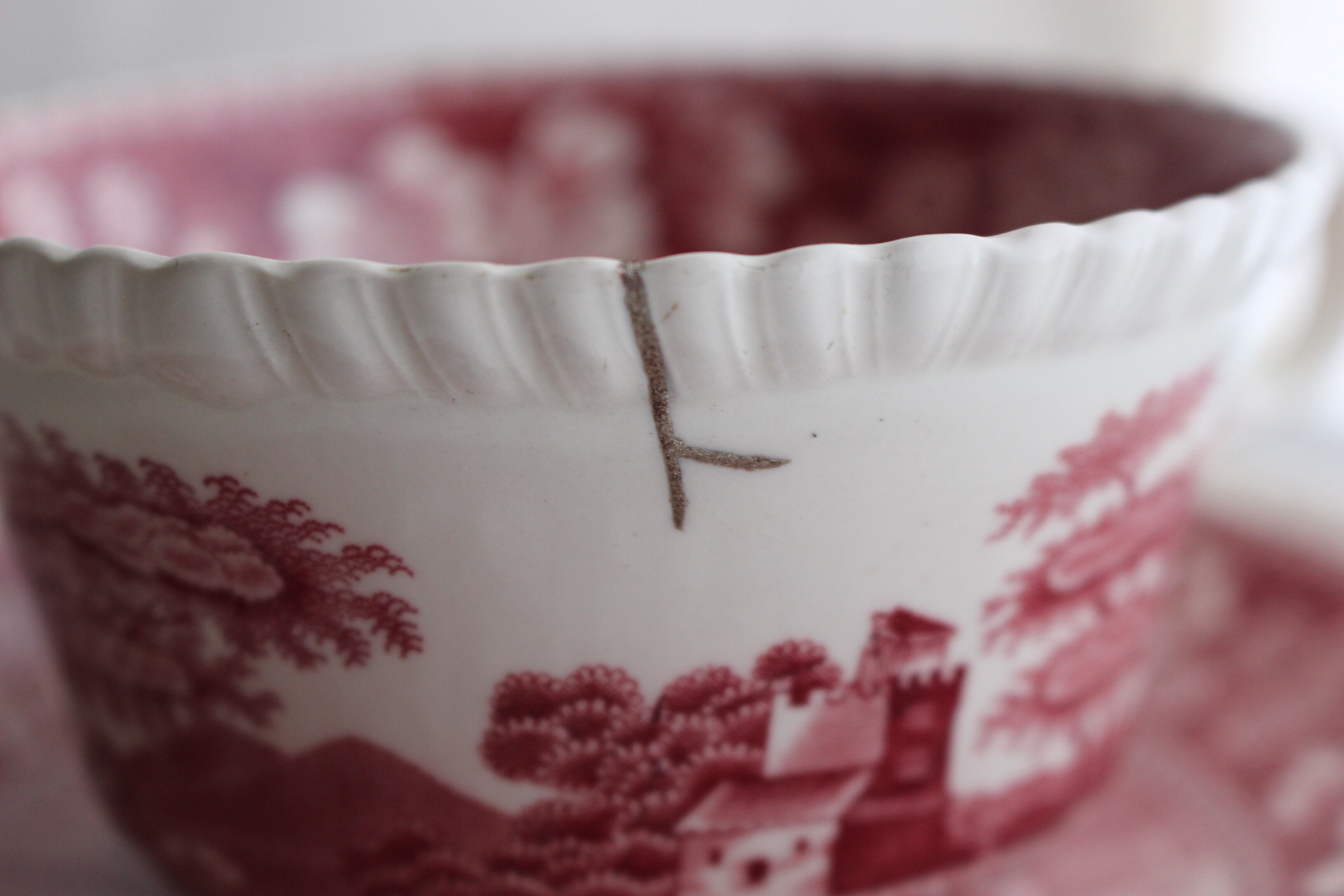 ひび(ニュウ)を金色が強めの錫で金継しました。内側は赤の漆をピンクに合わせ調整し、錫の上からかけ、柄になじませています。外側は陶器のオフホワイトに合わせ、そのまま錫仕上げにしています。